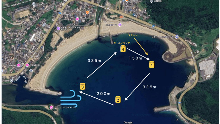 ゴール手前のゲートは間違いやすく、進行方向右側がラップゲート(周回用)・左側がゴールゲート(フィニッシュ)です。ゴールゲートの手前にはコースロープ設定されており、小さなブイが付いています。周回選手が間違って進入してしまい、ロープをくぐってラップゲートへ向かうと失格となります。