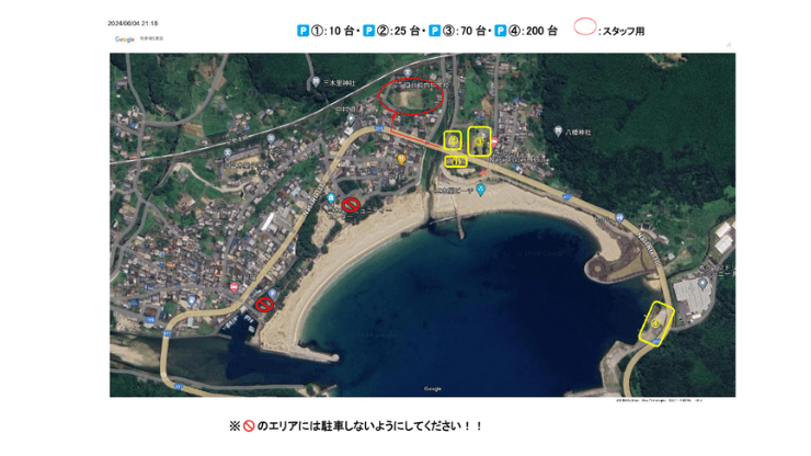 ただし、大会会場の駐車スペースは限られているため、少し離れた臨時駐車場【図④駐車場】に案内されることも。